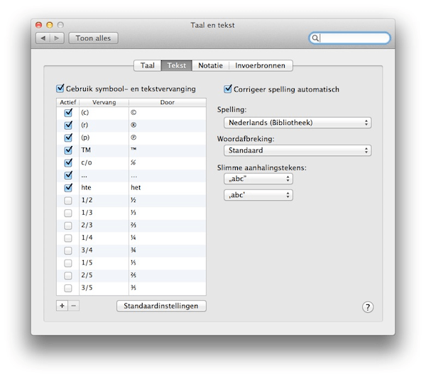 - Kies apple ▸ Systeemvoorkeuren ▸ Taal en tekst ▸ Tabblad ‘Tekst’