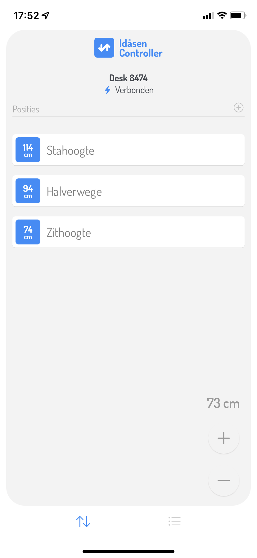 Nadat je de app hebt geïnstalleerd, moet je deze calibreren, zodat de app weet welke hoogte in centimeters bij de laagste stand hoort. Na de calibratie kun je eenvoudig voorkeuren instellen. Ik heb er 3 ingesteld: ‘Stahoogte’, ‘Zithoogte’ en ‘Halverwege’. Die laatste, daar kom ik verderop op terug.