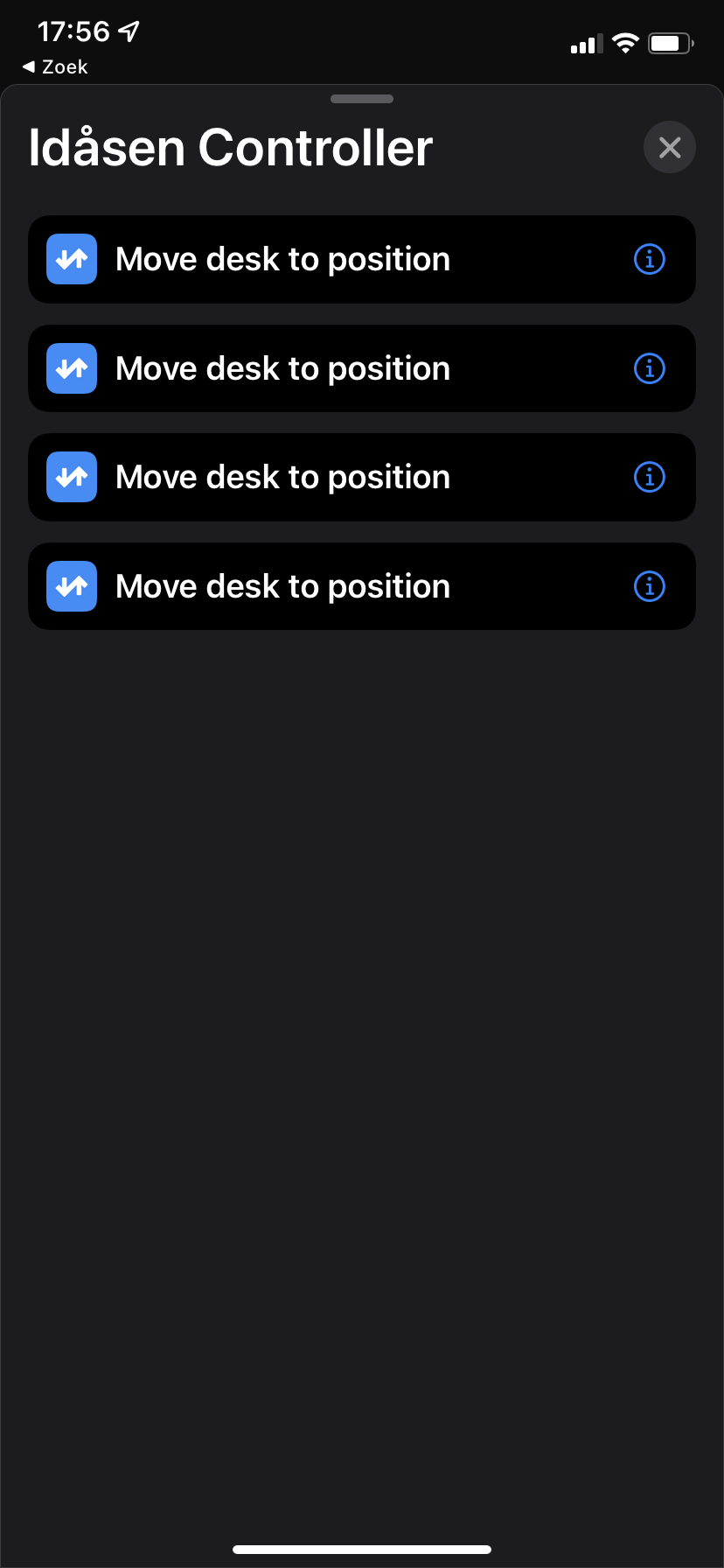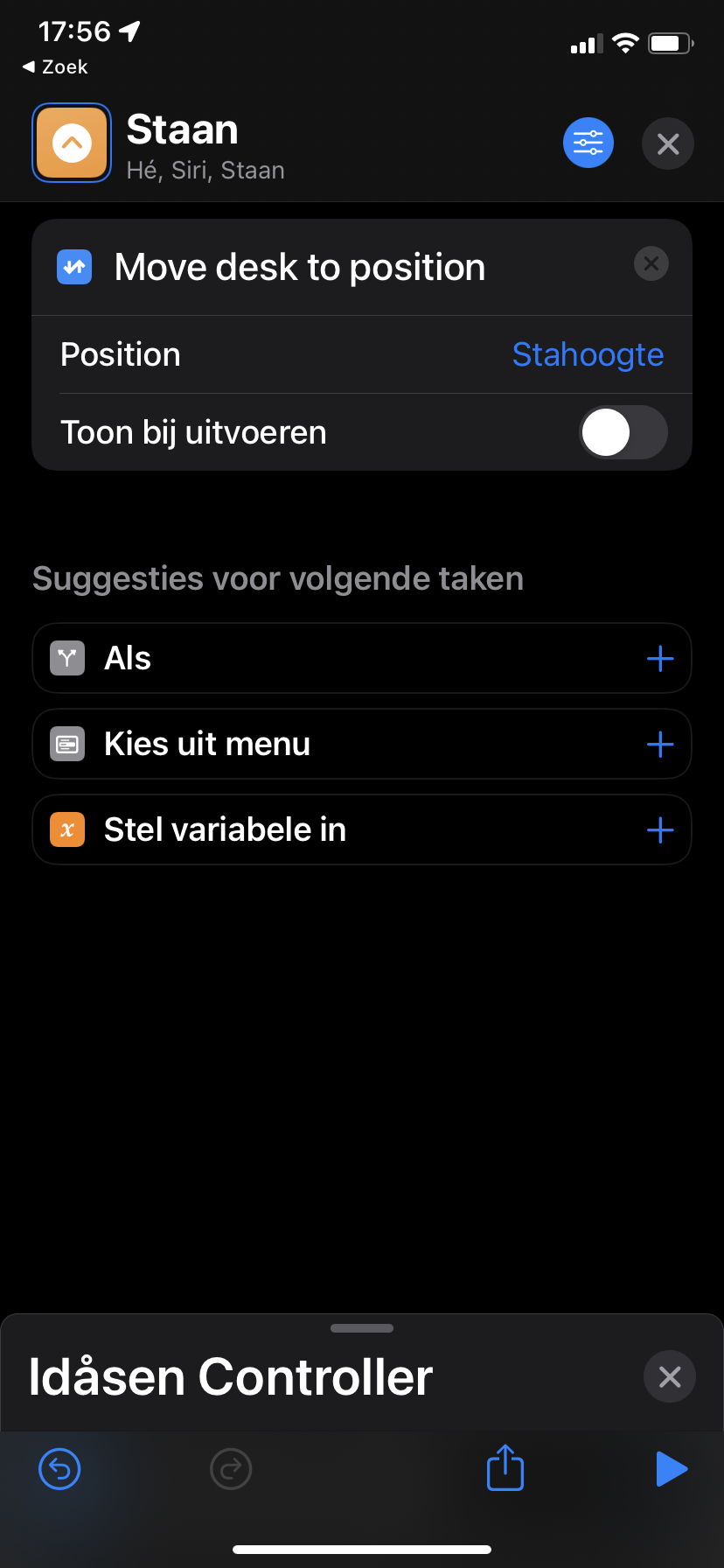 Idasen Controller heeft ondersteuning voor Siri-opdrachten. Dat zijn eenvoudige tot heel complexe automatiseringen, die je zelf kunt maken zonder programmeerkennis. Die opdrachten maak je eenmalig, en daarna kun je ze steeds opnieuw opstarten. Ik heb apart opdrachten gemaakt om het bureau in te stellen op zithoogte en op stahoogte. Dat doe je als volgt.